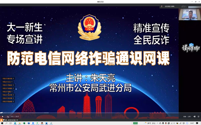 为增强新生的安全防范意识,提升新生的安全素养,9月16日下午,常州市公安局武进分局朱天亮警官为2022级新生上了一堂生动而具有警示意义的安全教育线上课。