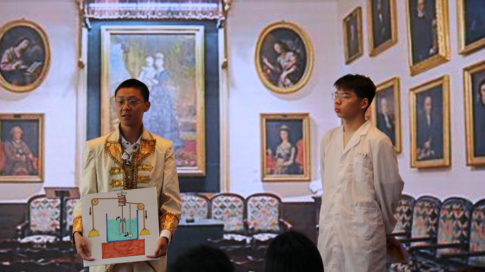 课程教师殷开梁对课堂剧的创作背景做了介绍,他告诉同学们:发现、分析、解决问题的过程非常重要,希望同学们在这个过程中培养自己的科学素养和科学精神、学会如何思考。同学们在深入查找资料的基础上,将文字内容转化为人物语言、动作、神情等,辅助舞台和旁白,进行生动的表演。剧中搭配西欧服饰道具和舞台背景,让迈尔、焦耳等科学家“活”起来、“动”起来,通过话剧的形式生动演绎了热力学第一定律的发展过程,给观众带来了一场跨越古今的对话。同时身临其境的演绎也让同学们体验到了科学的发展充满艰辛和困苦,也体会到了其中的科学家精神。