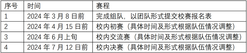 4、校内决赛。学校将于2024年7月12日前组织校内决赛,根据全国决赛竞赛要求对各支队伍的作品进行现场评审与打分,选拔队伍参加区域赛。