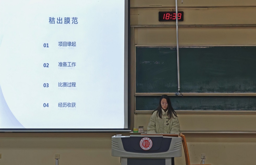 唐子宸以“只争朝夕,不负韶华”为题,强调了团队合作的重要性,并分享了团队成员如何利用各自的专业知识和技能为课题带来新思路。佟心琳则详细介绍了项目背后的辛勤工作,包括假期下乡实地走访和采样分析,以及如何将上届比赛的失利转化为动力,以更加饱满的热情和扎实的准备迎接新的挑战。他们的分享不仅展示了团队合作的力量,也激励着同学们积极进取,在实际实践应用中增本领,长才干。