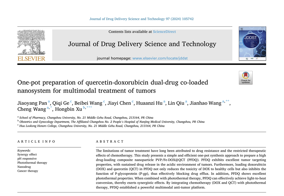 近日,华院221戈琪琪同学参与的研究论文“One-pot preparation of quercetin-doxorubicin dual-drug co-loaded nanosystem for multimodal treatment of tumors”在期刊Journal of Drug Delivery Science and Technology(SCI三区) 发表。
