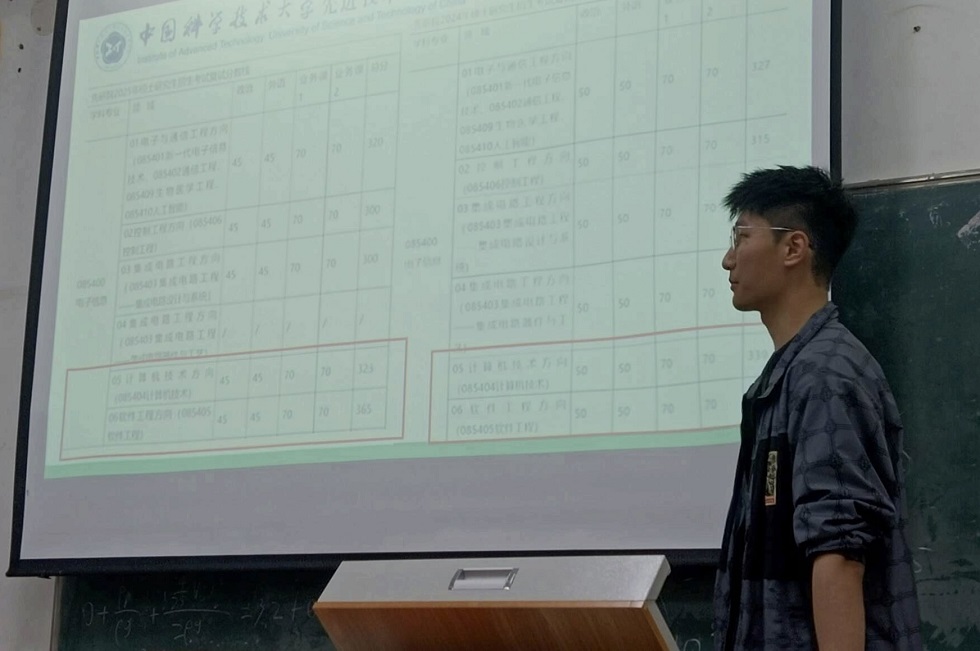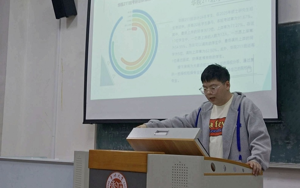 分享会上,2021级学生代表结合自身经验,从多个方面为学弟学妹们提供了备考指导。朱陈、许方言等同学介绍了2025届毕业生考研的择校与录取情况,分析了各专业考研形势;胡修琪、金宇航等同学分享了各专业的初试复习方法;邓亲俊、刘天佑等同学讲解了复试准备的要点;赵天磊等同学介绍了调剂的流程、注意事项;颜喜娴分享了直博申请的经历。各位分享的同学分工明确,为学弟学妹提供了全面的备考参考。