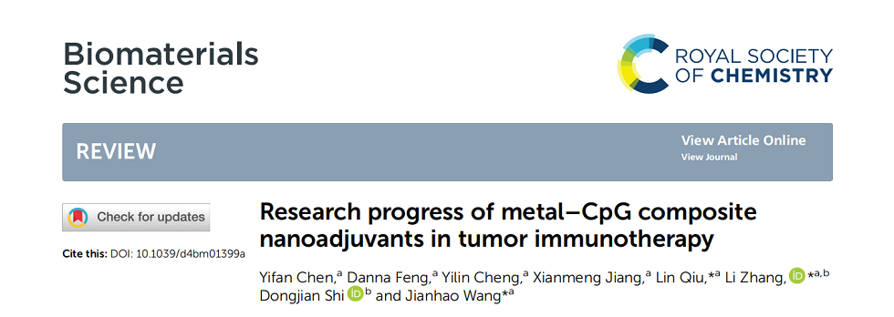 近日,色情直播 221班程奕霖同学作为课题参与者,其研究论文Research progress of metal–CpG composite nanoadjuvants in tumor immunotherapy在《Biomaterials Science》(SCI一区)上发表,程奕霖为文章三作。