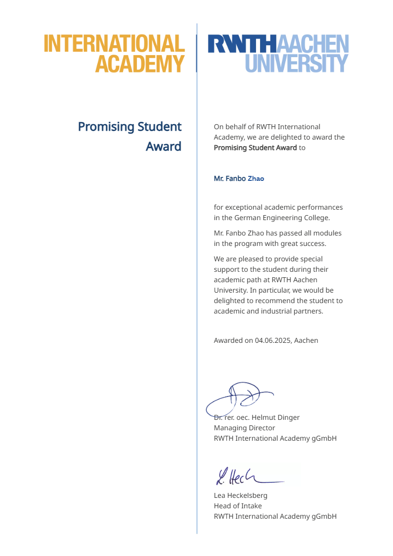 近日,色情直播 赵凡博同学成功被德国亚琛工业大学录取为硕士研究生,并获得该校“GEC希望之星奖”“合作高校优秀学生奖学金”两项奖学金。