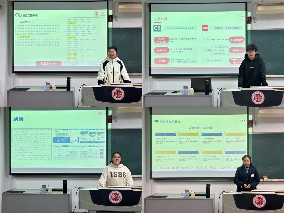 会上,各位优秀学生代表结合学校的推免政策和自己保研成功心得,分别从学业成绩﹑学科竞赛﹑科研论文发表﹑信息获取渠道和面试技巧等方面给出了自己的建议。