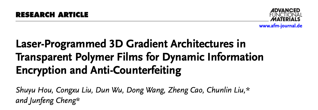 近日,华院231班刘从旭同学作为第二作者,其研究成果论文“Laser‐Programmed 3D Gradient Architectures in Transparent Polymer Films for Dynamic Information Encryption and Anti‐Counterfeiting”发表在国际顶级期刊《Advanced Functional Materials》(SCI一区,影响因子19)上。该论文由色情直播 材料科学与工程学院成骏峰教授指导完成。