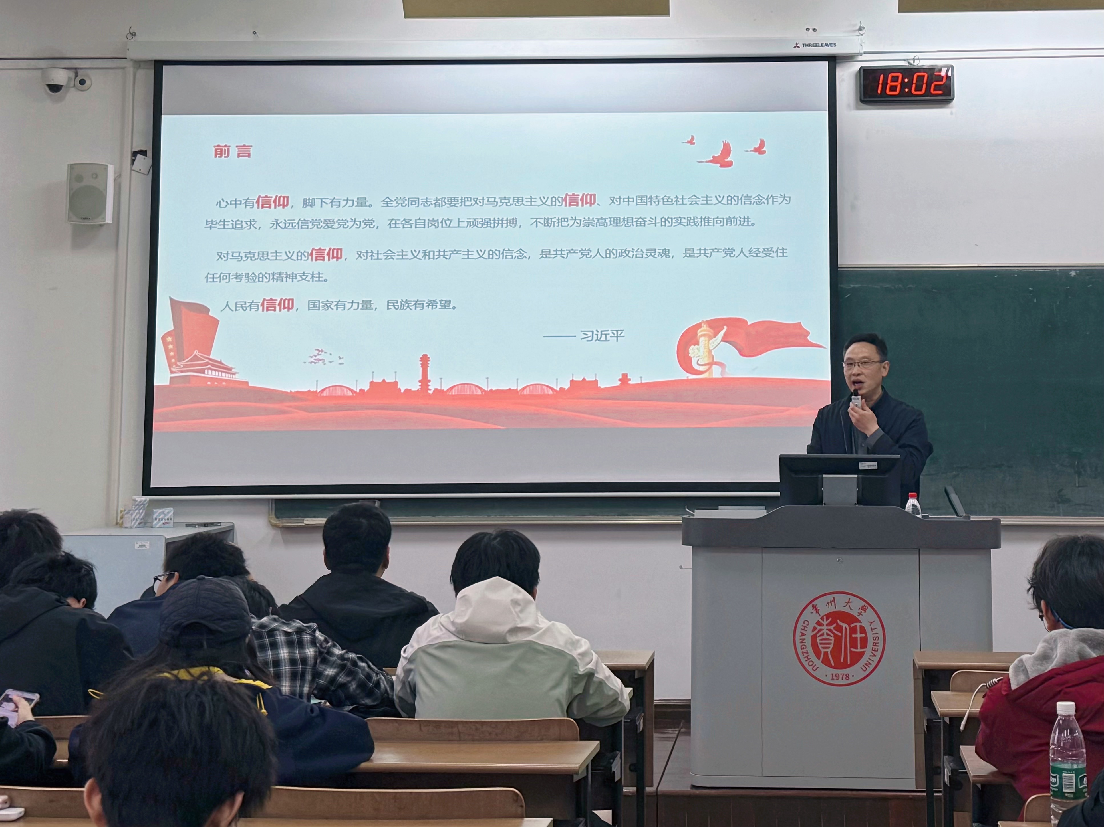 在解读信仰科学内涵时,王欢没有局限于理论讲述,而是借助历史典故、党史故事和身边榜样进行说明。他援引《论语》中“民无信不立”的论述、革命烈士张志新为捍卫信仰而惨遭迫害的事迹、红船精神的历史传承和常大学子易鉴政坚守初心的实践案例,使抽象的概念获得生动的诠释。针对部分青年存在“信仰迷茫”“信仰缺失”的现象,他以“没有栏杆的桥”为喻,指出缺乏信仰会导致方向迷失,对个人成长、事业发展乃至国家民族长远发展构成深层次危害。